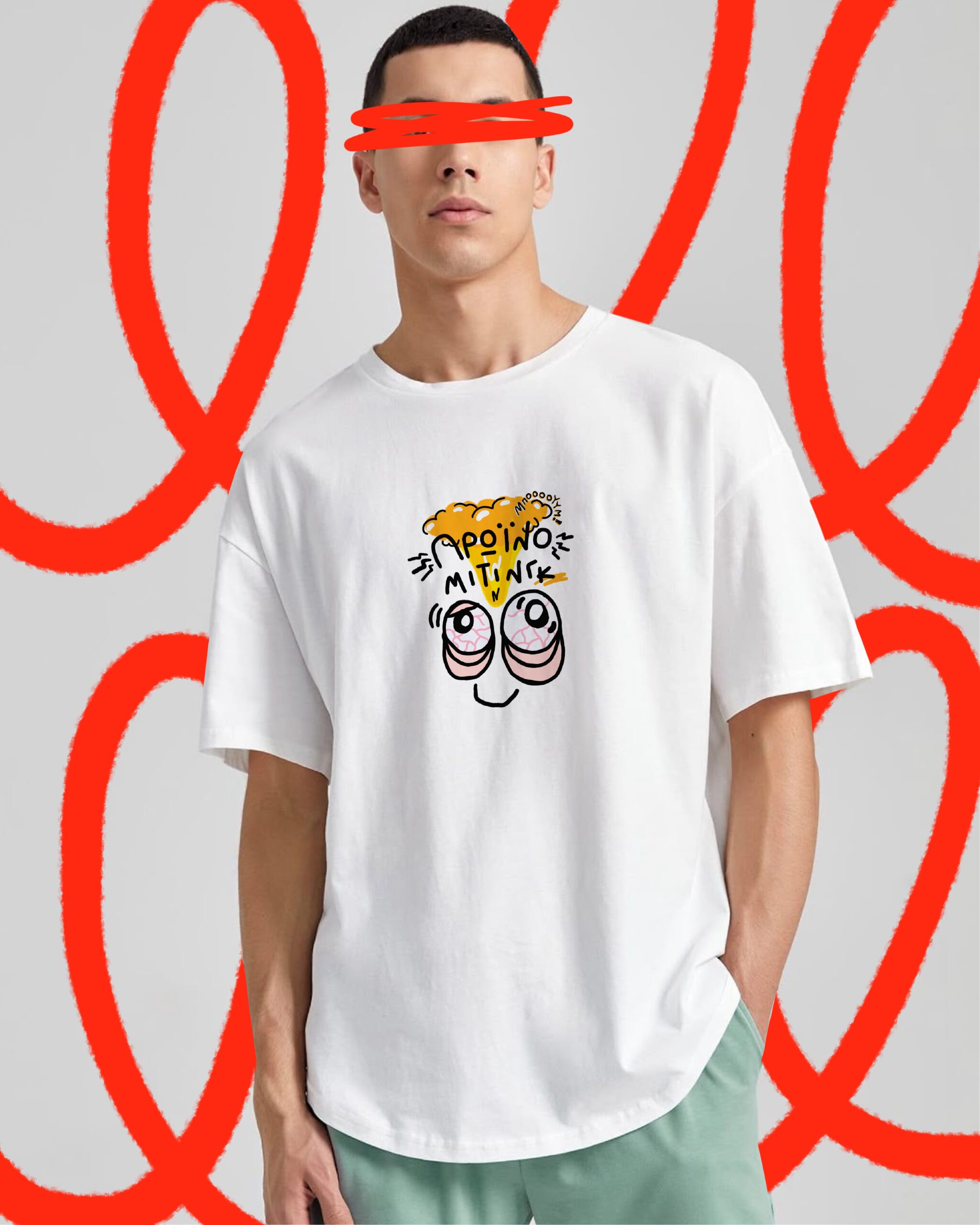 Βαμβακερή λευκή oversized μπλούζα με μεγάλο, χειροποίητο σχέδιο στην πλάτη (15 x 25 εκ. περίπου) και μικρό μπροστά (10 x 10 εκ.) Τα illustration είναι σχεδιασμένα από εμάς και η στάμπα είναι DTF.